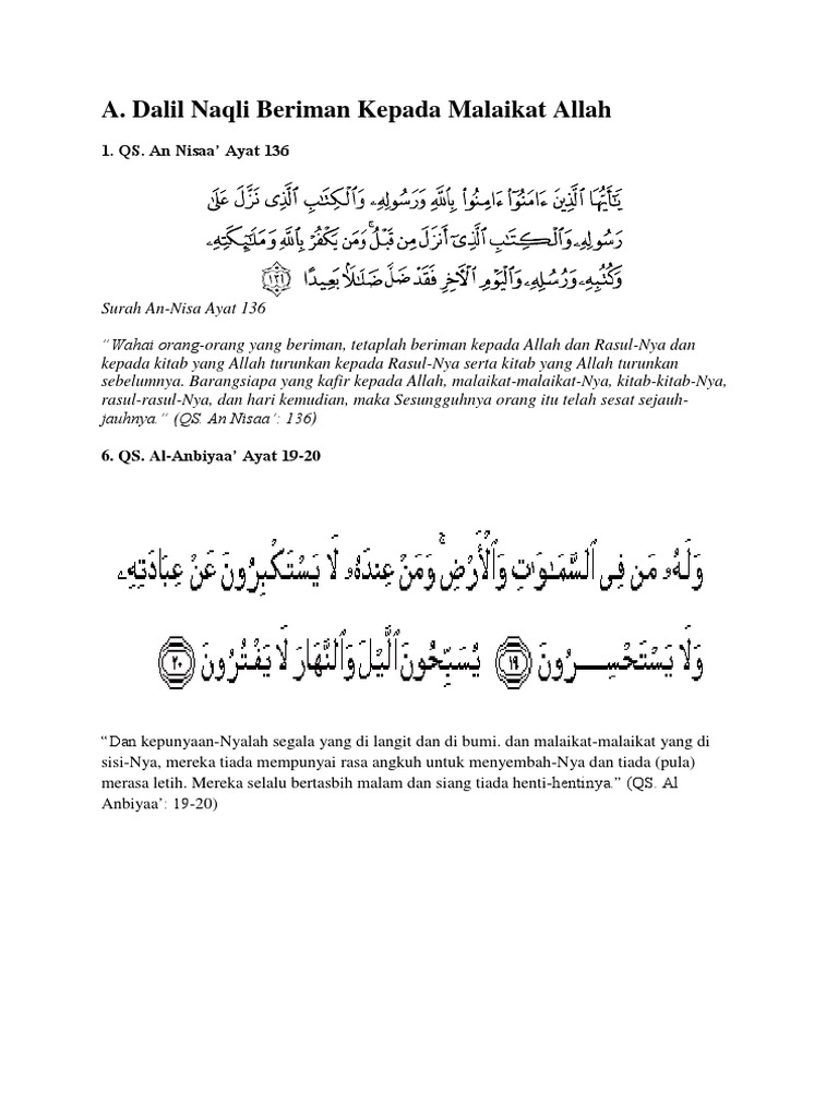 Dalil Naqli Iman Terhadap Malaikat Dalil iman kepada malaikat ada di QS An-Nisa ayat 136. Rasul telah beriman kepada Al-Quran yang diturunkan kepadanya dari Tuhannya demikian pula orang-orang yang. Hukum Beriman kepada Malaikat Dalil dan Hikmahnya.